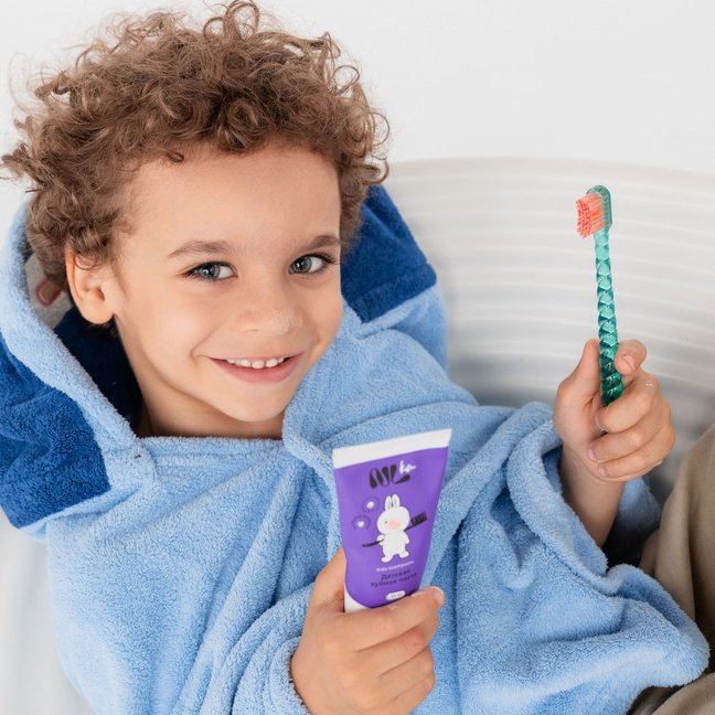 Зубная паста с безопасным составом без красителей, фтора и SLS тщательно очистит зубы и способствует профилактике кариеса.