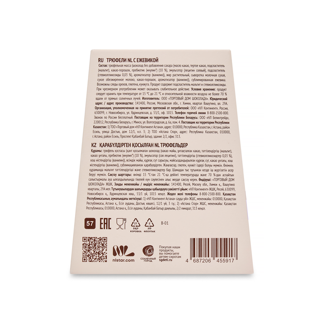 Трюфели NL — это невероятно нежное лакомство без сахара с добавлением натуральной сублимированной ежевики. Насладитесь по-настоящему сбалансированным и многогранным шоколадным вкусом с натуральной кислинкой ежевики. Это не просто десерт, а уникальное и легкое сочетание, которое порадует вас в любой момент.